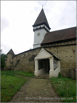 Nachdem ich mir die Kirchenburg in Maierus (Nussbach) angesehen hatte (wo ich eine halbe Ewigkeit an einem Bahnübergang wartete), war Belin (Blumendorf / Blumenau) mein nächstes Ziel, von dessen Kirchenburg ich über GoogeEarth (earth.google.de) Satellitenfotos erhalten hatte. Die Wehranlage selbst war leider verschlossen und aufgrund des Regens und meines verdreckten Aussehens hatte ich wenig Lust, mich im Ort nach dem Schlüssel zu erkundigen. Also ging ich über das Friedhofsgelände um die Kirchenburg herum, von der auch noch die außen liegenden Gräben vorhanden sind. Links der Anlage befand sich rückseitig des Grabens eine Gruft, deren Spalt in der Tür sogar einen Blick in ihr Inneres erlaubte. Verzierte, verwitterte Metallsärge standen dort auf steinernem Podest; ein Bild, wie aus einem Film. Unter dem Giebel der Gruft befand sich zudem ein halbrundes vermoostes Fenster, dessen verzierte Gitterstäbe von einzelnen Spinnwegen behaftet waren.