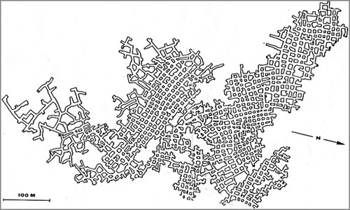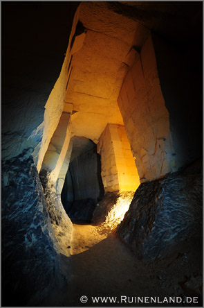 Das nun folgende Ziel erwies sich als das spannendste und abenteuerlichste dieser Tour. Bereits vor 2000 Jahren wurde hier im Tagebau Mergelgestein abgetragen, ab dem 15. Jahrhundert zum Bau von Häusern und Kirchen auch untertage. So entstand ein verzweigtes Gangsystem von mehreren hundert Kilometern, das sich in 10 bis 30 Metern Tiefe durch den Berg zieht, davon alleine rund 300 Km auf belgischer Seite. Was im ersten Moment unglaublich erscheint, wird letztendlich erst verständlich, wenn man sich die Pläne der einstigen Mergelgruben anschaut, die das Zustandekommen solcher Längen deutlich machen. Hierfür die Karte einer der drei Gruben: