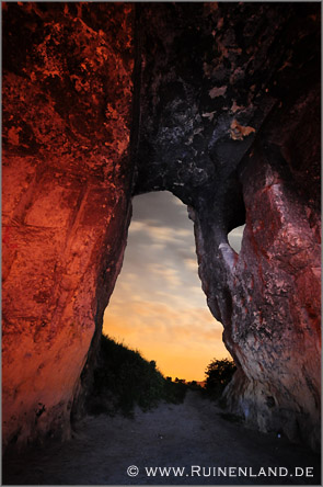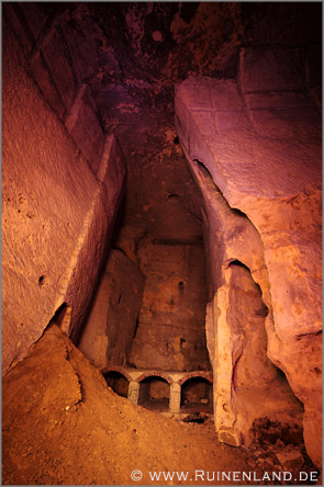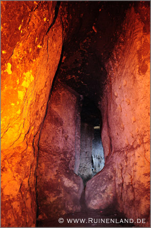 Am Eingangsportal trafen wir einen ortsansässigen Mann, der mit seinem Hund den Abhang hinaufgestiegen war. Wir unterhielten uns eine Weile mit ihm und er berichtete von dem leichteren Ausgang im Südosten, den er uns gerne zeigen wollte. Dabei orientierte er sich an Fahrradspuren im Staub, die seiner Erzählung nach von den zeitweise hier stattfindenden (wenn auch nicht ganz legalen) Führungen stammten. Allerdings waren die Reifenabdrücke zwischen den unzähligen Fußspuren stellenweise nicht mehr zu sehen, so dass auch er ein paar Mal den falschen Weg einschlug. Letztendlich fanden wir aber doch wieder nach draußen, wo ich wenigstens noch ein Bild des kleineren Zugangs im Südosten machte.
