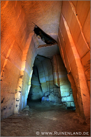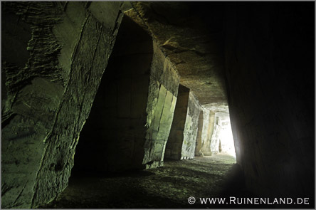 Die dritte Mergelgrube hat gleich mehrere offene Eingänge; einen mit steilem Pfad im Osten und einen weiteren mit leichtem Weg im Südosten des Berges. Von letzterem wussten wir anfangs jedoch nichts und so kletterte ich das kurze Stück den Hang hinauf. Leider versäumte ich es, von den drei höher gelegenen Portalen, die mit Abstand die imposantesten aller Zugänge waren, eine Außenaufnahme zu machen. Miri wollte erst unten bleiben, entschied sich glücklicherweise aber dann doch dazu, mir zu folgen.