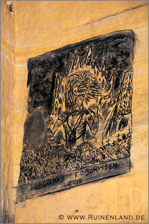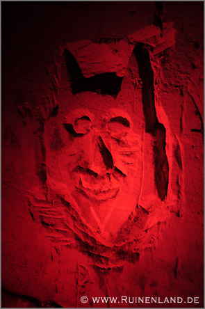 Auch hier fanden sich an den Wänden eine Vielzahl von Skulpturen - Gesichter, eine Burg, Schädel, geometrische Formen und vieles mehr. Ärgerlicherweise waren diese Höhlen, im Gegensatz zu den anderen beiden Gruben, an vielen Stellen großflächig mit Graffiti beschmiert. Teelichter, Getränkedosen und Müll zeugten zudem von unzähligen hier abgehaltenen Partys. Auch Pfeile in allen Farben und Richtungen waren bis in die Tiefen der Gruben an die Wände gesprüht; derart verwirrend, dass man sich kaum noch danach richten konnte. Ich orientierte mich an einem weißen Pfeil, der aufgrund eines Punktes an dessen Ende noch ein wenig heraus stach, um letztendlich nicht völlig planlos durch die verzeigten Schächte zu laufen. Irgendwann endeten diesen Pfeile jedoch, sodass wir schließlich den Rückweg antraten. Dabei flatterten, wie schon in den anderen Gruben zuvor, mehrfach Fledermäuse an uns vorüber. An dieser Stelle die Anmerkung, dass Höhlen, Schächte und dergleichen zum Schutz dieser Tiere von Ende Oktober bis Ende März generell nicht betreten werden sollten! Andernfalls besteht die Gefahr, dass die Fledermäuse aus ihrem Winterschlaf erwachen und daraufhin verenden, da sie in den Wintermonaten keine Insekten zum Fressen finden.
