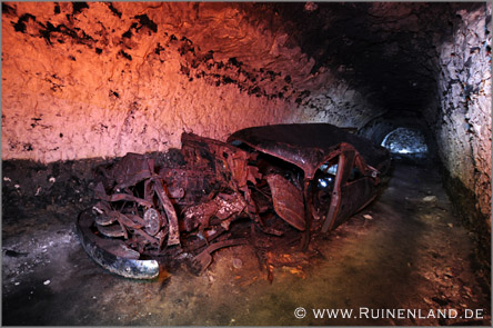 Die Urbexer, die wir anfangs in der ersten Grube trafen, hatten uns noch von einem nahe gelegenen Tunnel erzählt, den wir nun als nächstes aufsuchen wollten. Laut ihrer Aussage handelte es sich hierbei um einen Bahntunnel, die Beschaffenheit der grob behauenen Wände und die anfangs geringe Höhe ließen jedoch eher auf eine andere Nutzung schließen. Die gesamte Länge von knapp 2 Km wollten wir nicht mehr durchschreiten, aber zumindest etwa das erste Drittel nahmen wir uns vor. Wie sich herausstellte, handelte es sich um ein doppeltes Gangsystem, an dessen Eingang ein altes, verrostetes und in sich zusammengebrochenes Auto stand. Mittels Taschenlampen, farbigem Licht und Mehrfachbelichtungen gestalteten wir unsere Aufnahmen.