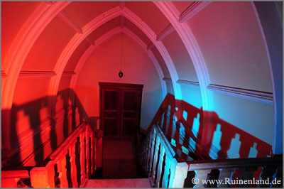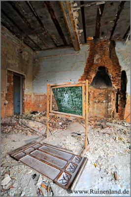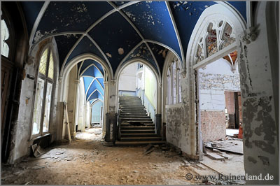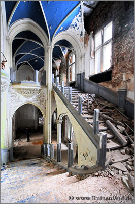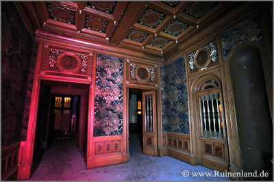 Meine erste Empfindung war eine Mischung aus Wut, Entsetzen und Hilflosigkeit. Ich wusste von alten Fotos, wie das Schloss einst eingerichtet war. Ich wusste von Fotos aus dem Internet, wie die Innenräume noch vor einigen Jahren aussahen. Ich wusste, dass inzwischen vieles kaputt, entwendet und zerfallen war. Aber mit solch einem Ausmaß hatte ich, erst Recht in Anbetracht des noch stattlichen äußeren Erscheinungsbild des Schlosses, nicht gerechnet. Es war in einziges Trauerspiel. Nicht primär in Hinblick auf den heutigen Zustand, sondern diesbezüglich insbesondere wegen den mutwilligen Zerstörungen in den letzten Jahren. Jüngstes Beispiel ist der verzierte Handlauf des einst massiven Treppengeländers, der vor genau einem Jahr zumindest in Teilen noch erhalten und vor Ort war.