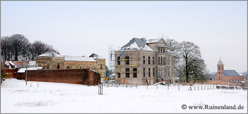 Auch dem nächsten Ziel widmeten wir nur einen kurzen Aufenthalt. Chateau Neufcour war eingerüstet und wurde gerade restauriert, so dass ich es lediglich mit einer Fernaufnahme würdigte. "Graue Kulisse vor grauem Hintergrund" war nun auch wirklich nicht so interessant und schien mir nicht lohnenswert genug, um dafür durch den Schnee über freies Feld zu laufen. Zumal auf dem Nachbargrundstück des Anwesens mit verschlossenem Haupttor Leute waren und wir es eh nicht unbemerkt hätten betreten können. Überhaupt meinte es das Wetter in den drei Tagen nicht wirklich gut mit uns. Der ständig nur graue Himmel ohne sichtbare Wolkenstrukturen war doch etwas frustrierend. Andererseits hatte ich auch keine Lust, die Fotos nachträglich bis zum Exzess zu bearbeiten und zu verfälschen, nur damit sie tolles Licht und einen imposanten Himmel aufweisen.