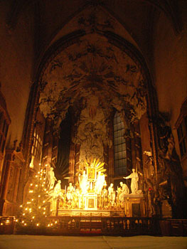 Wohl nur wenige würden es beim Schreiten auf den Bodenplatten des Stephansdomes vermuten, dass sich unter ihren Füssen eine Welt der Toten befindet. Im linken Seitenschiff befindet sich der Eingang in diese düstere Unterwelt (nur mit Führungen zu besichtigen, 4 Euro). Als ich auf die nächste Führung wartete, füllte sich der Treffpunkt zu meinem Missfallen immer mehr, was letztendlich dazu führte, dass rund 35 Personen am Rundgang durch die engen Katakomben teilnahmen. Wie sich wohl jeder vorstellen kann, ließ diese Menschenmasse in den verzweigten feuchten Gängen kaum die entsprechende Stimmung von Tod und Vergänglichkeit aufkommen. Aber auch sonst hätte sich dieses Empfinden bei mir wohl nur an den wenigsten Stellen entwickelt. Denn nach dem Abstieg gelangte man zwar zuerst in den ältesten Teil der Katakomben; dieser wurde jedoch komplett renoviert und im Rahmen dessen mit weißem Verputz und Neonlampen versehen. In keinem Fall etwas, was ich mit dem Begriff „Katakomben“ verbinden würde. Nach dem Durchschreiten einer unterirdischen Kapelle kamen wir in eine Gruft, in der sich mehrere verschlossene Kupfersärge mit den Leichnahmen von Bischöfen und Kupfergefäße befanden. Die Metallgefäße, die teils mit Kreuzen und Totenschädeln verziert waren, enthielten die Eingeweide der Habsburger (es war in Wien Brauch, die Körper der Verstorbenen zu leeren und die Innereien eingelegt in Alkohol separat zu bestatten. Die Körper der Habsburger wurden in der Kaisergruft beigesetzt). Nach einem kurzen Stopp in jener (ebenfalls neu renovierten) Gruft, in welcher die Domherren und Bischöfe hinter roten Marmorplatten bestattet sind, begaben wir uns in den zwar später erbauten, jedoch in meinen Augen weitaus interessanteren Teil der Katakomben: dunkle Gänge mit modriger Luft führten weiter ins Erdinnere bis in einen hoch gewölbten Raum, in welchem sich ein vergittertes Fenster befand. Dahinter standen verfallene Särge und aufgeschichtete Knochen, stark zerfallene Schädel starrten mich fratzengleich an. Hier löste ich mich von der Führungs-Gruppe und trottete ihr nur langsam hinterher, um zumindest den weitaus düstereren Teil der Katakomben in Ruhe anschauen zu können. Es folgten weitere Räume, die bis obenhin mit menschlichen Gebeinen angefüllt waren – ein Resultat aus vergangenen „Aufräumarbeiten“.