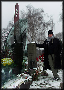 Nach deren Besichtigungen bog ich schräg links ab und folgte einem schier endlosen Pfad zwischen Gräbern, auf denen Krähen ihre Spuren im Schnee hinterlassen hatten. Die dortigen hohen und dichten Bäume schützten mich zudem für kurze Zeit ein wenig vor Wind und Schnee. Mehrfach erblickte ich alte Gräber und vereinzelte Statuen, welche mich wiederholt dazu veranlassten, den ursprünglich gewählten Weg zu verlassen und die Richtung zu wechseln. Nach einer guten Stunde wusste ich nicht mehr wirklich, wo ich nun war. Mit Hilfe eines Plans, den man in jedem Fall bei sich führen sollte, fand ich mich jedoch schnell wieder zurecht und erreichte schließlich das Grab von „Hans Hölzel“, besser bekannt als „Falco“ (zu finden in Gruppe 40).