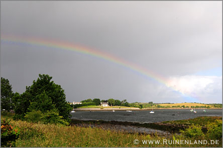 Laut Internet sollte es zu besichtigen sein, der abgesperrte Parkplatz und das verschlossene Tor sagten jedoch etwas anderes. Ob die Burg dauerhaft oder nur vorübergehend geschlossen ist, und wir einfach nur Pech hatten, kann ich jedoch nicht sagen. Ein kurzer, wenngleich starker Regenschauer verhinderte zwar auch eine nähere Erkundung der verwachsenen Ruine von Rath Durlais, bescherte uns dafür aber einen Regenbogen.