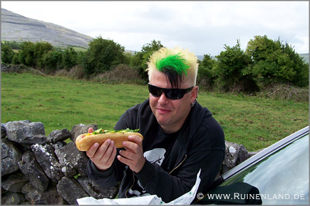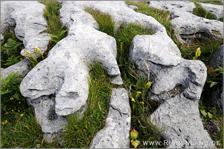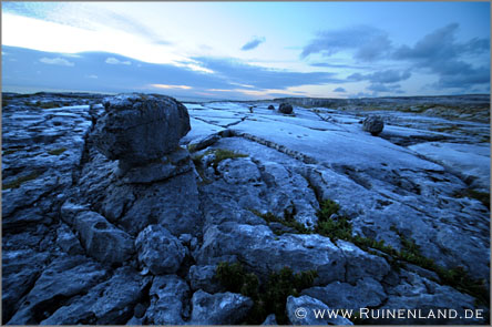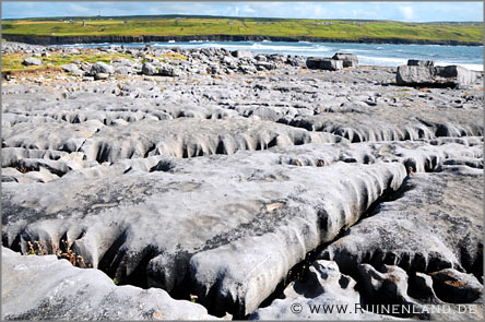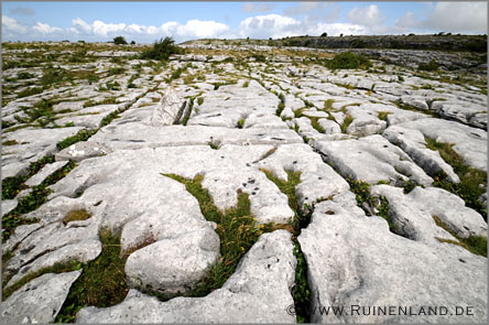 Nach einer kurzen Besichtigung des Newtown Castle, ein runder Burgturm aus dem 16. Jh., bogen wir in die Karstlandschaft der Burren ab. Der Burren, zu deutsch "steiniger Ort", umfasst eine Fläche von 250 km² Kalksteingebiet. Die Oberfläche der Burren ist durch etwa knietiefe Karren (durch Verwitterung und Oberflächenwasser entstandene Rinnen) in rechteckige Felder gegliedert, was landschaftlich ein oftmals surreales Bild erzeugt.