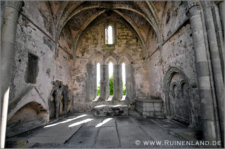 Ein Abstecher führte uns zur 1194 von Dónal Mór O’Brien of Thomond gegründeten Corcomroe Abbey, auch bekannt als "Abtei der Burren". Das Kloster, in dem Conor na Siudane O’Brien of Thomond (Enkel von Dónal Mór) begraben liegt, wurde 1564 aufgelöst.