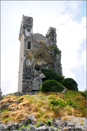Der Zugang zur nächsten Ruine, dem im 15. Jahrhundert erbauten Bealaclugga Castle, war indes komplizierter. In einer kleinen Bucht gelegen, führen keine Wege (bzw. bestenfalls Trampelpfade) zu ihr, so dass Birgit und ich uns durch fieses Dornengestrüpp kämpfen mussten, um sie überhaupt zu erreichen. Zu allem Überfluss lag in den Büschen auch noch eine tote Kuh, von der jedoch nur noch Haut und Knochen übrig waren. Für den Rückweg wählten wir deshalb einen etwas weiteren Weg, in der Hoffnung, dass dieser einfacher sei. Dort verfolgten uns schließlich jedoch "vermeintlich Fleisch fressende Killerkühe" und zum Schluss mussten wir auch noch eine äußerst brüchige, mit Dornenranken bewachsene Mauer überklettern.