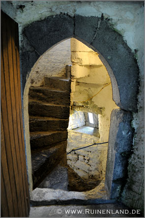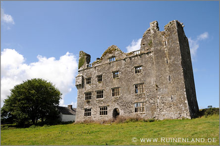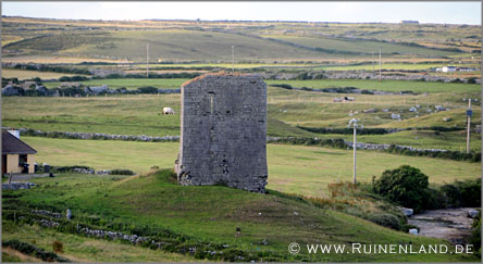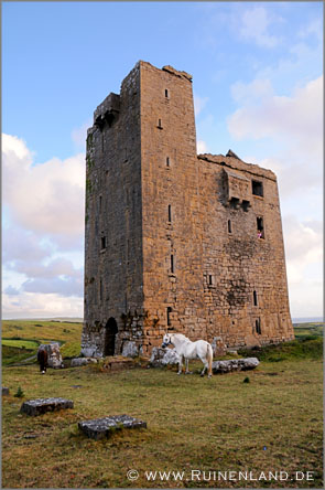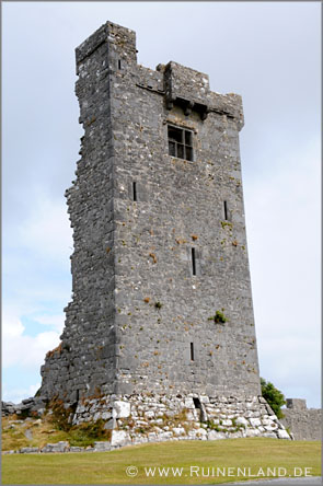 Nach über drei Stunden an den Klippen kehrten wir zurück zu unserem Mietwagen und stellten mit Freude fest, dass die Schranke des Parkplatzes geöffnet war. So sparten wir uns die 8,- Euro Parkgebühr. Im Licht der tief stehenden Sonne machten wir uns auf den Rückweg, auf dem ich noch an der Ruine des Ballinalacken Castle vorbeifuhr. Seine genaue Entstehung ist unbekannt, wird jedoch auf das 14.-16. Jahrhundert datiert, wenngleich noch Keller aus dem 10. Jh. existieren. Ursprünglich war die normalerweise verschlossene, zweistufige und bis zu 5 Stockwerken hohe Burg lediglich als Fotostopp eingeplant, da sie nur im Rahmen einer zuvor angemeldeten Führung besichtigt werden kann (Infos im angrenzenden Ballinalacken Hotel aus dem Jahr 1840). Zu unserem Glück war jedoch gerade eine Besuchergruppe dort, zu der wir uns schließlich frech dazugesellten und so bis in die oberen Stockwerke hinaufsteigen konnten. Ganz ungefährlich war dies jedoch nicht, da die von der Turmtreppe abzweigenden Öffnungen gleich mehrfach im Nichts endeten.