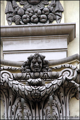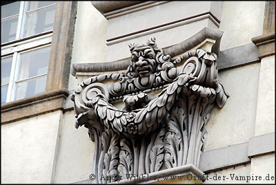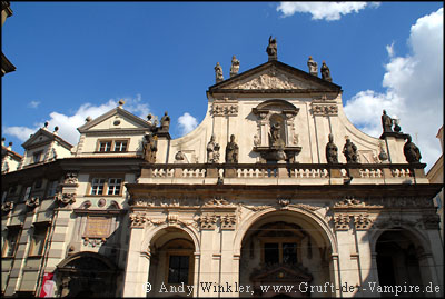 Mein erstes Ziel war das Klementium, ein ehemaliges Kolleg des Jesuitenordens aus dem Jahr 1556. Heute beherbergt es mit Kirche und astronomischem Turm unter anderem die Nationalbibliothek und ist neben der Burg das zweitgrößte zusammengehörende Gebäudeensemble von Prag. Über dem verzierten Haupteingang standen diverse Statuen und von der Seitenfassade starrten mich mehrere steinerne Fratzen an. Nachts sollen im Klementium flüsternde Stimmen und klappernde Knochen zu hören sein.