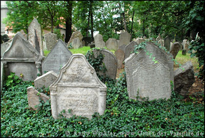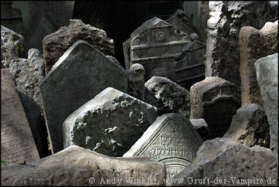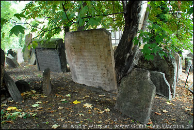 Bis 1787 wurden auf dem alten Friedhof alle in Prag ansässigen Juden bestattet. Aufgrund des begrenzten Platzes mussten die Toten übereinander beerdigt werden, so dass die rund 12.000 Grabsteine heute auf unterschiedlichem Niveau dicht beieinander stehen. Das älteste Grab gehört dem Dichter Avigdor Karo und stammt aus dem Jahr 1439, die meistbesuchte Grabstätte ist die des Schriftgelehrten Jehuda Löw ben Bezalei (Rabbi Löw, gestorben 1609). Ihm wurde von der Nachwelt später die Legende vom Prager Golem angedichtet, ein künstlicher Mensch aus Ton und Lehm.