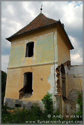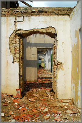 Auf der Weiterfahrt fiel mir ein Turm über dem Ort Camarasu (Kammerisch) ins Auge. Das konnte nur ein Schloss sein, so dass ich Attila bat, dieses anzusteuern. Es befand sich auf einem Firmengelände, aber wir bekamen auf Nachfrage die Genehmigung, es zu besichtigen. Im Inneren der Ruine waren noch Reste von schmuckvollen Tapeten zu sehen, ringsherum hatte man Firmengebäude angebaut, die mittlerweile jedoch ebenfalls leer standen oder bereits in Trümmern lagen.