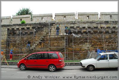 Ich wollte Albert noch die Stadtmauer zeigen, leider wurde diese gerade restauriert und gereinigt und war deshalb mit einem Gerüst umgeben. Anschließend hob ich noch mal Geld am Automaten ab und wir gingen shoppen. Neben einem Geburtstagsgeschenk für eine Freundin und Zigaretten (wie praktisch, dass Albert nicht raucht, und ich so die doppelte Menge mitnehmen konnte. Bei einem Preis von etwa 1,80 Euro pro Schachtel...) kaufte ich noch drei weitere Bücher. In einem Antiquariat unter anderem den riesigen, fast 900 Seiten starken Wälzer "Atlas der siebenbürgisch-sächsischen Kirchenburgen und Dorfkirchen, Band 1" von Hermann Fabini. Dieses vergriffene Buch kostet in Deutschland zwischen 90,- und 140,- Euro, in Cluj habe ich umgerechnet dafür gerade mal rund 65,-Euro bezahlt :-)