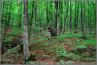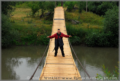 Als nächstes versuchten wir unser Glück bei der Cetatea Mihaly, auf der anderen Seite des Flusses "Olt" (Alt). Von Racos führte eine schwankende Hängebrücke über den Fluss, bei der ich doch ein wenig weiche Knie bekam. Auf der anderen Seite fragte ich nach dem Weg zur Burgruine und man schickte uns Flussaufwärts und dort rechts in den Wald. Um es abzukürzen: Über zwei Stunden suchten wir auf zwei verschiedenen Bergen alle möglichen matschigen Waldwege ab, jedoch gänzlich ohne Erfolg. Wieder unten angekommen, fragte ich bei einem Bauern nochmals nach dem Weg, um schließlich zu erfahren, dass die Ruine NOCH weiter vom Dorf entfernt liegt, als wir bereits gelaufen waren. Inzwischen vollkommen durchnässt und schlammgetränkt, hatten Albert und ich nun aber keine Lust mehr, gingen (wieder über die schwankende Hängebrücke) zum Auto und fuhren zurück nach Racos.