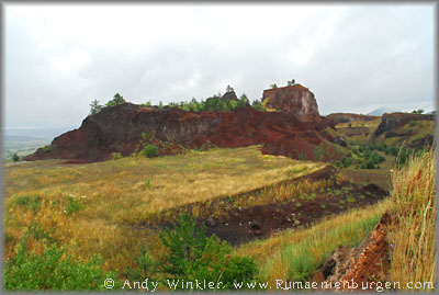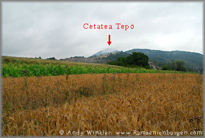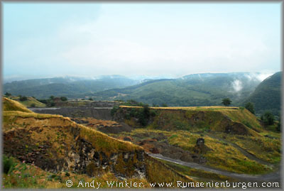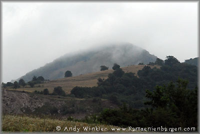 Der Weg zum Burgberg der Cetatea Tepö, welcher bei trockenem Boden befahrbar ist, bestand aus einer dicken Schlammschicht, in der die Reifen bereits nach wenigen Metern durchdrehten. Keine Chance, dort heute mit einem normalen PKW hoch zu kommen. Aufgrund des Wetters & der Entfernung von 1,5 Stunden Fußweg (und da ich wusste, dass auf dem Berg lediglich noch minimale Mauerreste stehen), begnügten Albert und ich uns mal wieder mit Fernaufnahmen des nebelverhangenen Burgbergs.