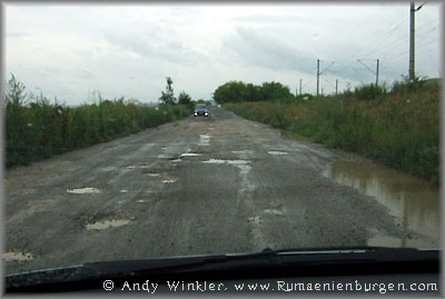 Nach einem leckeren Frühstück bei Sara mit selbstgemachter Kirschmarmelade und einem Fotostopp an der grau verhangenen Ruine der Bauernburg Rupea (Reps) ging es weiter nach Racos (Krebsenbach). Die Straße dorthin war entgegen aller Hoffnung leider noch immer so schlecht, wie vor zwei Jahren. Größtenteils unbefestigt und voll mit Schlaglöchern, deren zum Teil beachtliche Tiefe man nicht mal abschätzen konnte, da sie nahezu gänzlich mit Wasser gefüllt waren. Gut durchgeschüttelt brachten wir die 12 Km hinter uns, als es pünktlich mit unserem Eintreffen in Racos wieder zu regnen begann *nerv*