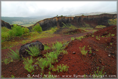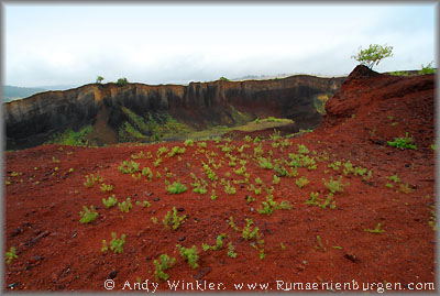 Dort stiegen wir zum Vulkankrater hinauf. An sich ein tolles Fotomotiv mit rotschwarzem Gestein und einem mächtigen Felsberg in der Mitte, aber aufgrund des nach wie vor strömenden Regens hatten Albert und ich mittlerweile nicht mehr wirklich viel Begeisterungsfähigkeit übrig.
