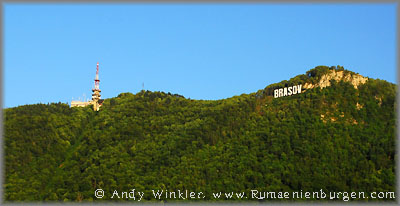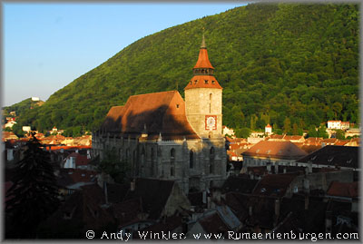 Vom Schlossberg fuhren wir zum Turnul Alb (der weiße Turm) und Turnul Negru (der schwarze Turm), Teile der einstigen Stadtbefestigung. Von hier hatte man einen schönen Blick auf die Stadtmauer mit ihren Türmen und der Weberbastei, die Biserica Negru (schwarze Kirche, so genannt nach dem Stadtbrand von 1689) und den gegenüber liegenden Berg der einstigen Festung Cetatea Brasovia (nur noch minimale Mauerreste) mit dem Schriftzug der Stadt. Die tief stehende Abendsonne tauchte zudem die gesamte Altstadt in ein intensives, warmes Licht.