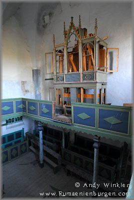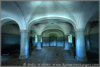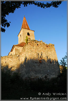Nachdem ich auch in Tilisca noch Straßenhunde gefüttert hatte, fuhren wir zu unserem letzten Besichtigungspunkt, der Kirchenburg-Ruine von Dobarca (Dobring). Eigentlich hatte ich hier lediglich Außenaufnahmen eingeplant, aber da inzwischen ein Teil der Umfassungsmauern eingestürzt war, konnte die gänzlich verwachsene Burg durch das große Loch betreten werden. Das Innere der Kirche bot ein trauriges Bild; die Orgel und der Altar waren mutwillig zerstört, Bänke zerschlagen und Scheiben eingeworfen. Dem hohen Gras und Gestrüpp nach zu urteilen, war schon längere Zeit niemand mehr hier oben, genutzt wird lediglich noch die neuere Kirche im Dorf. Die ungewohnt hohen Kellergewölbe waren im hinteren Teil zwar vermauert, konnten jedoch noch betreten werden und wer sich wie wir durch Brennnesseln und Dornenhecken schlägt, kommt auch noch bis zum vorgelagerten Torhaus.