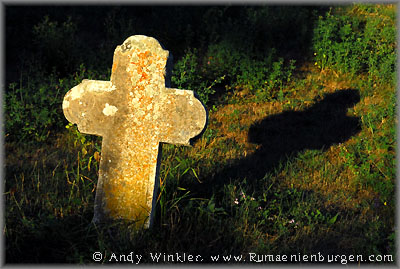 An der Außenwand der kleinen Kirche waren noch Reste von gemalten Verzierungen erkennbar und ein Kreuz des vorgelagerten Friedhofes warf im Licht der tief stehenden Sonne einen lang gezogenen Schatten auf die Wiese.