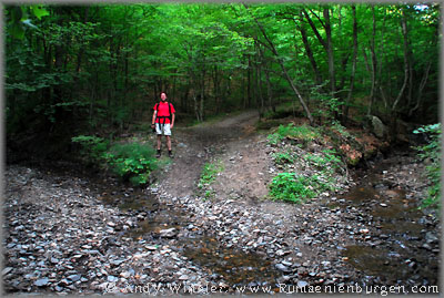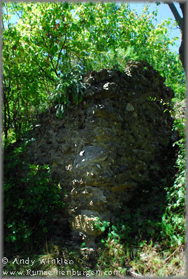 Über den Graben, wo wir zwei Rehe aufschreckten, kletterten wir zu den an der steilen Hangseite gelegenen Ruinenresten, die nicht wirklich leicht zu erkunden waren, zumal es hier schon lange keine Wege mehr gab. Hätte ich anhand des Grundrisses in meiner Tasche nicht gewusst, wo die Mauern stehen, hätte ich sie aller Wahrscheinlichkeit nach gar nicht erst gefunden. Albert war schon weiter oben, während ich mich durchs Gestrüpp schlug und drei weitere große Mauerstücke fand. Da Albert diese auch sehen und fotografieren wollte, blieb ihm schließlich nichts anderes übrig, als nochmals den Hang hinunter zu klettern ;-)