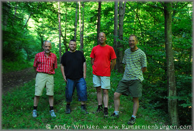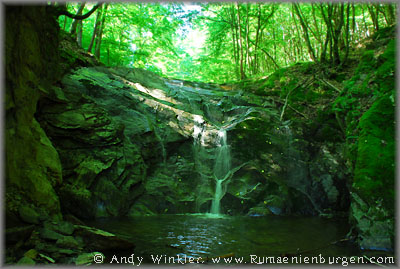 Glücklicherweise war der Boden heute trocken, so dass wir die ersten vier Kilometer zu den Bergen mit dem Auto fahren konnten. Dort stellten wir den Wagen im Wald ab und gingen das letzte Stück zu Fuß, bei dem wir vier Mal den Bach überquerten und anschließend vorbei an der Teutsch-Quelle (so benannt zur Erinnerung an den Besuch des Ortes von Bischof Teutsch am 29. September 1875) zur Ruine aufstiegen. Der Weg war gut zu bewältigen, nur meine Füße meldeten sich mal wieder.
