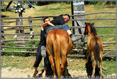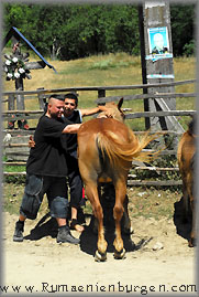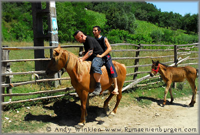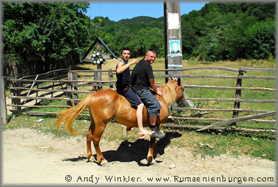 Wieder im Dorf angekommen, kaufte ich mir erst mal ein kühles Getränk und lud den jungen Mann, der uns den Weg zum Burgberg gezeigt hatte, auf ein Bier ein. Daraufhin wollte er mir ein besonderes Foto ermöglichen, führte mich zu einem Pferd (ich erinnere an Vintu de Jos - ich und Pferde!) und wollte, dass ich aufsteige. Ich hatte mich dem Pferd inzwischen zwar in einem großen Bogen genähert und versuchte es auch, jedoch kam ich da partout nicht hoch. So hievte er mich schließlich nach oben und sprang selbst aufs Pferd, welches sich dabei erschreckte und einen Satz machte, was ich wiederum unter grölendem Gelächter der Dorfgemeinschaft mit einem lauten Schrei quittierte. Albert war ja fein raus, er konnte während dessen das gesamte Schauspiel auf Fotos festhalten ;-)