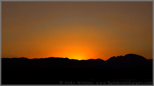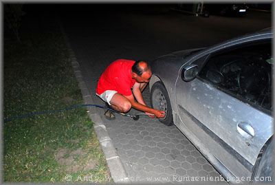 Um Mitternacht waren wir wieder in Cluj-Napoca (Klausenburg). Wir tankten voll und gingen etwas essen, anschließend wollten wir den "dezent" zugestaubten Wagen waschen lassen. Gerade wollte ich in die Waschanlage fahren, als mir ein seltsames Geräusch auffiel und Albert meinte, wir hätten einen Platten. Das durfte doch nicht wahr sein; was wir ohne Folgen für unmögliche Strecken gefahren sind - und jetzt zogen wir uns an der Tankstelle ein Loch im Reifen zu. Wir pumpten den Reifen noch mal auf, das Loch war jedoch so groß, dass wir es uns frühestens während der letzten Kilometer auf der Hauptstraße zugezogen haben konnten, wahrscheinlich tatsächlich erst an der Tankstelle. Aber es nutzte ja nichts, der Reifen musste gewechselt werden. Dabei kam uns ein Mitarbeiter der Tankstelle zu Hilfe, so dass wir es zumindest nicht selbst machen mussten. Na ja, zwei Platte Reifen und eine verlorene Radkappe während der letzten sechs Jahre sind bei den Straßenverhältnissen in Rumänien eigentlich kein so schlechter Schnitt...