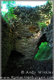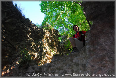 Der Burgberg fiel nach allen sichtbaren Seiten steil ab und so fragte ich am Kiosk, welchen Weg wir gehen müssten. Ein junger Mann führte uns zum Berg und zeigte mit dem Wort "sus" (oben / hoch) auf einen mit Dornen verwachsenen Pfad, der steil nach oben führte. Ungläubig fragte ich noch zweimal nach, ob dies tatsächlich der einzige Weg sei - und scheinbar war er das. Um es gleich vorweg zu nehmen: Auch Zebernicului gehört wohl zu jenen Burgen, die mich vermutlich kein zweites Mal sehen werden!