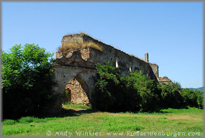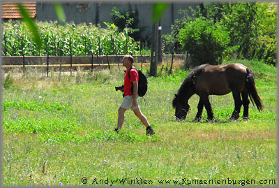 An der Kirchenburg von Sebes (Mühlbach) legten wir ebenfalls noch einen Fotostopp ein. Im Anschluss kauften wir in einem gegenüber liegenden Kiosk Getränke und fuhren schließlich zur Schlossruine Martinuzzi in Vintu de Jos (Unterwinz). Albert kletterte dort kurz entschlossen über das Tor und ich folgte ihm. Während er sich ungestört auf dem Areal bewegen konnte, hatte mich sofort ein Pferd, welches dort graste, als unliebsamen Besucher ins Visier genommen. Aufgrund eines recht schmerzhaften Kindheitserlebnisses habe ich vor Pferden doch einen gewissen Respekt; und als ob das Tier dies ahnte, verfolgte es mich mit immer schnelleren Schritten. So trat ich sehr zügig den Rückweg an ;-) Das Pferd ließ Albert hingegen anschließend natürlich in Ruhe passieren...