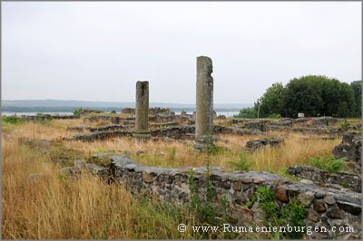 Die Straße nach Cerneti entpuppte sich als aufgeweichter Feldweg, so dass wir auf die Besichtigung des "Cula lui Tudor Vladimirescu" verzichteten und, bei mittlerweile strömendem Regen, zurück nach Drobeta-Turnu Severin fuhren. Ich parkte vor den großflächigen Stadtruinen, als mich der Museumswärter am Eingang dieser auf meinen Reifen aufmerksam machte - wir hatten einen Platten. Auch so etwas, auf das ich bei meinen Rumänienreisen dankend verzichten könnte! Außerdem hatten wir keine Ahnung, wie wir uns die Reifenpanne zugezogen hatten, zumal der Wagen kurz zuvor noch ganz normal fuhr und von dem Platten nichts zu merken war. Ich hatte jetzt aber keine Lust für einen Reifenwechsel und wollte mir zuvor erst die Ruinen des römischen Drobeta ansehen, die ausgehend von einem Castrum aus dem Jahr 105 n. Chr. aus der Zeit bis Mitte des 6. Jahrhunderts stammen.