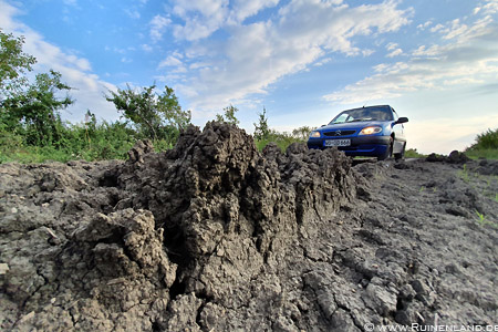 Mittlerweile ging schon die Sonne unter, aber ein letztes Tagesziel wollte ich trotzdem noch anfahren, wenn ich schon mal in der Gegend war: ein kleines Mausoleum mitten in einem Feld, das ich per Langzeitbelichtung notfalls auch mit der Taschenlampe ausleuchten könnte. Es lag zwar lediglich zweieinhalb Kilometer Luftlinie entfernt, die Anfahrt zog sich aufgrund eines Flusses ohne Brücke letztendlich aber auf einen Umweg von über 35 km - inkl. der erneuten Fahrt über den holprigen Feldweg. Wir waren froh, als wir nach den ersten neun Kilometern wieder feste Straßen unter dem Auto hatten...