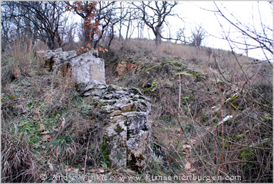 An der Abfahrt zum Dorf Cladova hielt ich an, um auch den dortigen Burgrest zu besuchen. Der Weg auf den Hügel war zwar nur sehr kurz, dafür aber extrem steil und trotz Wanderwegzeichen nahezu gänzlich abgegangen. Zu allem Überfluss lag im Wald auch noch ein toter Hund. Von der einstigen Burg war außer einem größtenteils verfüllten Graben und geringen Mauerresten kaum mehr etwas zu erkennen.