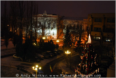 Um 16.00 Uhr kam ich am Hotel Parc gegenüber der Festung an, ein zum Stadtbild passender, hässlicher Betonbau. Die Dame an der Rezeption war sehr freundlich, aber das war auch schon alles. Dank des größtenteils defekten Lichtes tastete ich mich durch den dunklen Flur im zweiten Stock in mein doch recht verwohntes und völlig überheiztes Zimmer. Das Licht im Bad funktionierte ebenfalls nicht (auch eine Möglichkeit, um Strom zu sparen), die Steckdose war kaputt, das Fenster schloss nicht richtig und von draußen drang Straßenlärm hinauf. In Deutschland wäre ich definitiv nicht bereit gewesen, für ein solches Zimmer über 50 Euro zu bezahlen, in rumänischen Hotels ist es scheinbar aber wohl nahezu Standart. Allerdings hatte ich keine Lust, mir im Winter abends noch ein Zimmer suchen zu müssen, weshalb ich das Hotel bereits von Deutschland aus buchte. Zumindest hatte die Wanne im Badezimmer ausnahmsweise mal einen Stöpsel, so dass ich mir Wasser einließ und ein langes Bad nahm, wobei ich die Tür offen lies, um durch das vom Zimmer einfallende Licht überhaupt etwas sehen zu können. Von der Festung waren Schüsse zu hören, was mich jedoch nicht daran hinderte, in der Wanne einzunicken.