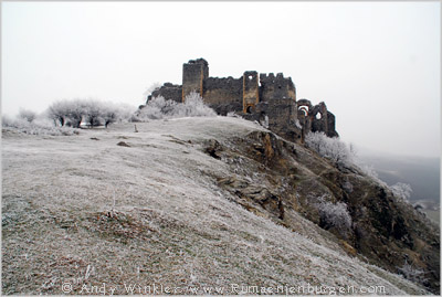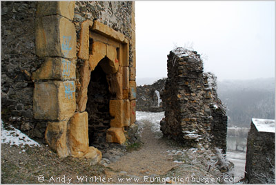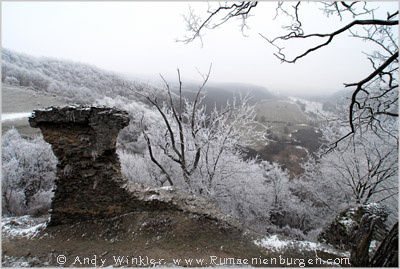 Von der Ruine standen noch hohe Mauern, Torbögen, Türme und Brückenpfeiler. Gefrorener Reif bedeckte die Bäume, während die unteren 2/3 des Berges in tristem Grau lagen. Die Burg befand sich zum Fotografieren somit auf perfekter Höhe. Innerhalb der Mauern waren mehrere Abfalleimer mit frischen Mülltüten und Hinweisschilder in fünf Sprachen, bitte die Umwelt sauber zu halten. Das hatte ich auf rumänischen Ruinen bisher noch nirgends gesehen, in jedem Fall lobenswert und ein Fortschritt.