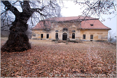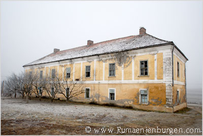 Die Seitenstraße nach Comlod (Komeloden) war wie erwartet: schlecht. Unbefestigt und voll mit Schlaglöchern; so, wie viele andere kleine Nebenstrecken in Rumänien auch. Aber zumindest war der Weg nahezu eisfrei, so dass er weitestgehend dennoch gut befahrbar war. In Comlod steht eines von mehreren Teleki-Schlössern in der Gegend von Reghin. Die bekannteren und erhaltenen Schlösser der Grafenfamilie Teleki (Teleky) aus dem 18. Jahrhundert befinden sich hauptsächlich zwischen Reghin und Targu Mures, so z.B. in Dumbravioara und Gornesti. Jenes in Comlod hingegen steht abseits und verfällt zusehends.