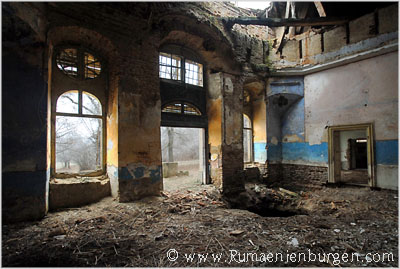 Auf der Vorderseite waren die Tür abgeschlossen und die Fenster vernagelt, so dass ich wenig Hoffnung hatte, einen Blick ins Innere werfen zu können. Rückseitig zeigte sich jedoch ein gänzlich anderes Bild. Türen und Fenster waren herausgebrochen, vormals edel verzierte Schmucksteine zerstört. Im Inneren bot das einstige Adelsanwesen mit zum Teil eingestürztem Dach und durchgebrochenem Boden ein noch traurigeres Bild. So ist es, erst Recht in Hinblick auf die abseitige Lage, eher unwahrscheinlich, dass dieses Gebäude nochmals instand gesetzt werden und nicht endgültig verfallen wird.