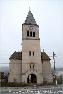 Weiter ging es nach Viile Tecii (Grosseidau, ehemals Ida), ein Dorf ziemlich genau in der Mitte zwischen Bistrita und Reghin, auf welches ich erst kurz vor meiner Winterreise über eine Sage aufmerksam wurde. Dort angekommen hielt ich am Ortseingang und blickte auf den Burgberg. Inzwischen war es 15.30 Uhr und nur eine halbe Stunde später würde es beginnen zu dämmern. Zudem aufgrund der Entfernung und des Wissens, dass auf dem Berg keine sichtbaren Mauerreste mehr stehen, verzichtete ich auf den Aufstieg. Aber immerhin stieß ich im Dorf selbst noch auf eine Kirchenruine. Von der Straße sah sie noch halbwegs passabel aus, rückseitig war jedoch bereits das gesamte Kirchenschiff weg gebrochen. Paradoxerweise war der Turm noch begehbar, wenngleich die Treppe auf halber Höhe im Nichts endete; offensichtlich an der früheren Stelle des Zugangs zur Empore. Nicht ganz ungefährlich, aber wie immer - Neugier siegt ;-)