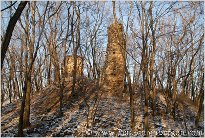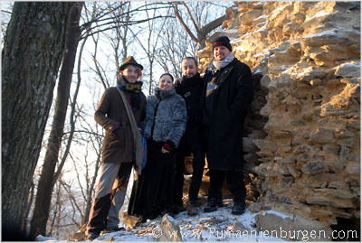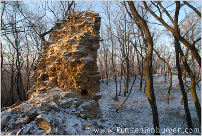 Entlang einer kleinen vereisten Schlucht führte ein Weg auf den Burgberg der Cetatea Valcau. Auch er hatte aufgrund vereister Flächen einige glatten Stellen, von einem Ausrutscher blieb ich aber verschont. Miri hingegen war wenig angetan, als der Weg etwa ab dessen Hälfte in einen steileren Trampelpfad überging. Beim Aufstieg versank jeder Schritt in tiefem Laub, aber nach knapp 30 Minuten waren wir schließlich alle oben; für rumänische Burgruinen also ein durchaus kurzer und einfacher Weg. Die Strahlen der rötlichen Abendsonne beleuchteten die Mauerreste des Burgareals auf dem 422 m hohen Berg, die man dank Winter und fehlender Blätter gut sehen und fotografieren konnte.
