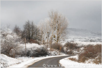 Den nächsten Stopp legten wir am Castelul Banffy in Treznea (Teufelsbrunn) ein, zu dem mir allerdings keine historischen Daten bekannt sind. Erst die dritte der in meiner Karte eingezeichneten Straßen nach Treznea erwies sich als im Winter befahrbar, die beiden vorherigen waren lediglich eingeschneite Feldwege. Zum ersten Mal während meines diesjährigen Urlaubs kam die Sonne raus, dafür fielen die Temperaturen auf eisige -15°C.