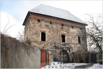 Nach etwa einer Stunde kamen wir in Zimbor an und parkten unterhalb des leer stehenden Schlosses Zsombory. Erbaut wurde es 1892, sein letzter Besitzer hieß Saulescu. Dieser verkaufte das Anwesen unlängst weiter, wie uns im Ort von einem älteren Herrn erzählt wurde. Vor einem Nebengebäude liefen Pfaue und Hühner durch den Schnee, durch die vergitterten Fenster des Schlosses konnte man noch die alten rotbraunen Kachelöfen sehen. Leider war lediglich der Keller zugänglich.