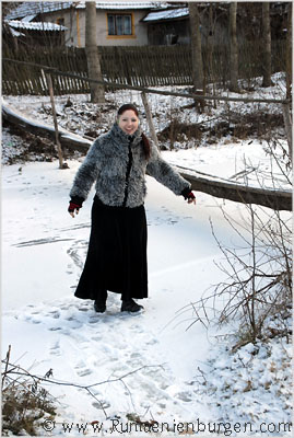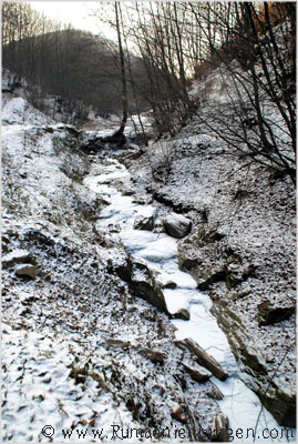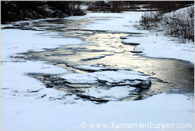Über unbefestigte aber gut befahrbare Nebenstraßen führte uns der weitere Weg über Valcau de Jos und Valcau de Sus nach Sub Cetate (Burgfeld). Der kleine Fluss war weitestgehend zugefroren und so wagte Miri eine Schlitterpartie auf dem Eis.