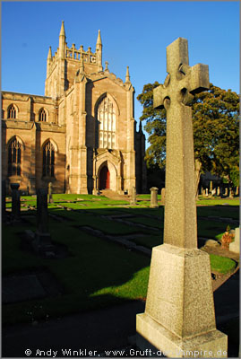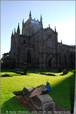 In Dunfermline angekommen kaufte ich mir erst mal zwei Landkarten, bevor Birgit und ich zur dortigen Klosterruine und Abtei gingen. Auf dem Friedhof hingen Spinnennetze an verzierten Kreuzen, die im Sonnenlicht leuchteten; mehrere Eichhörnchen sprangen über die Wiese und auf einem Grabstein sonnte sich ein Pfau. Bis auf einen Meter ließ er uns an sich herankommen, offensichtlich war er äußerst entspannt und Menschen gewöhnt.