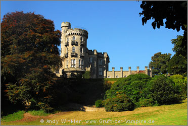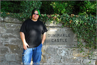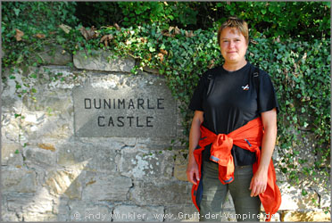 Wir liefen weiter entlang der Küste, bis über den Bäumen auf einem Hügel die Turmspitze des Dunimarle Castle auftauchte. Das Schloss, welches 1840 neben den Ruinen von Old Dunimarle Castle errichtet wurde, war ebenfalls Schauplatz im Kinofilm vom kleinen Vampir, darin lebte hier u.a. die Familie von Tony. An der Zufahrt war ein Hinweis, dass das Schloss nicht für Besucher zugänglich sei, zudem wurde vor Hunden gewarnt. Ich wollte das Anwesen jedoch unbedingt fotografieren und stieg entschlossen den kurzen Weg hinauf. Ein Gärtner mähte rückseitig des Schlosses den Rasen, weshalb die Hunde eingesperrt waren und ich ungestört Bilder machen konnte. Wir kamen also genau zum richtigen Zeitpunkt, ein Dank an den Gärtner. ;-)