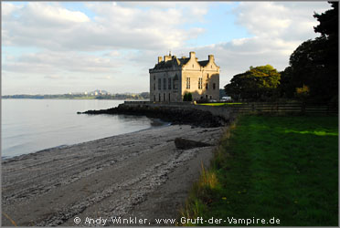 Wir liefen durch immer wechselnde Landschaft entlang der Küste mit Blick auf die Forth Bridge, durch weitläufige Wälder mit Fasanen und Füchsen und vorbei an Hügeln, auf denen Schafe grasten. Nach etwa drei Meilen dachte ich, dass wir nun doch endlich mal ankommen müssten und zweifelte, ob wir überhaupt noch auf dem richtigen Weg seien. So ging ich vom bewaldeten Weg ab zur Küste, in der Hoffnung, dort etwas zu entdecken. Wie sich herausstellte, eine richtige Entscheidung. Zwar waren wir noch nicht ganz am Dalmeny House, der Strand war jedoch mit unzähligen verschiedenen Muscheln bedeckt und man hatte von diesem Standpunkt aus einen schönen Blick auf das bewohnte Barnbougle Castle; ein Towerhouse von 1881, welches auf den Kellergewölben einer älteren Burg errichtet wurde.