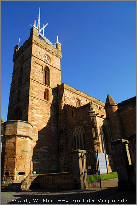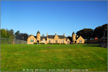 Heute wachte ich 10 Minuten bevor der Wecker klingelte auf. Also quälte ich mich aus dem Bett und ging duschen. Nach einem Frühstück mit Orangensaft, Toast und einem gekochten Ei fuhren wir mit dem Zug nach Linlithgow (vom Zug aus machte ich noch Bilder vom Niddry Castle), wo sich die Schule aus dem Kinofilm vom kleinen Vampir befindet. Verständlicher Weise konnten wir nicht hinein gehen, da die Kinder Unterricht hatten, aber das war auch nicht so wichtig. Hauptsache, ich hatte die Außenaufnahmen.